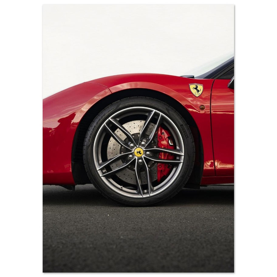 The Imperative of Control Rosso Corsa Imperative is a visceral exploration of the power required to master velocity. In the tradition of Dark Opulence, this image strips away the glamour to focus on the mechanical core of the Ferrari's performance: the wheel, the caliper, and the flawless precision of the braking system. The Rosso Corsa caliper—the symbol of the Ferrari racing badge—stands out as an aggressive visual anchor against the deep shadow of the fender and the textured surface of the tire. It is a study in purposeful, uncompromising engineering. This image captures the moment of absolute readiness, documenting the intricate relationship between heat, friction, and the relentless demand for speed. Archival of Intensity This is not a casual detail shot; it is an archival record of motorsport intensity. The immense clarity required to capture the fine etching on the wheel and the texture of the performance tire is guaranteed by the physical support of Gelato's Museum Grade Paper (250gsm). This heavy-weight stock ensures the profound blacks of the shadow lines are dense and enduring, while simultaneously allowing the intensity of the Rosso Corsa colour to project with absolute accuracy. A cornerstone piece in the Founder's Archive, this limited-edition print is reserved for the collector who understands that the true definition of power is not found in acceleration, but in the imperative to control it.
